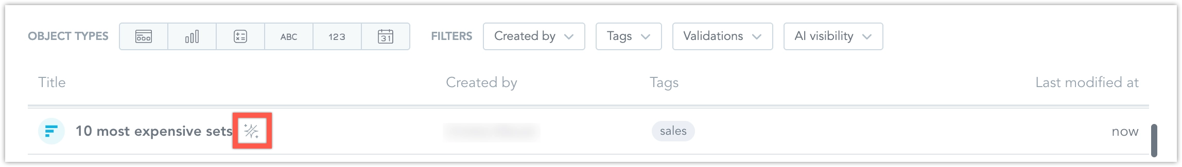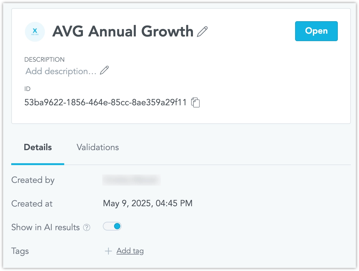 The Analytics Catalog can show and edit whether an object is hidden from AI. Hidden objects remain available in the catalog, but they are not used or suggested by AI features.
