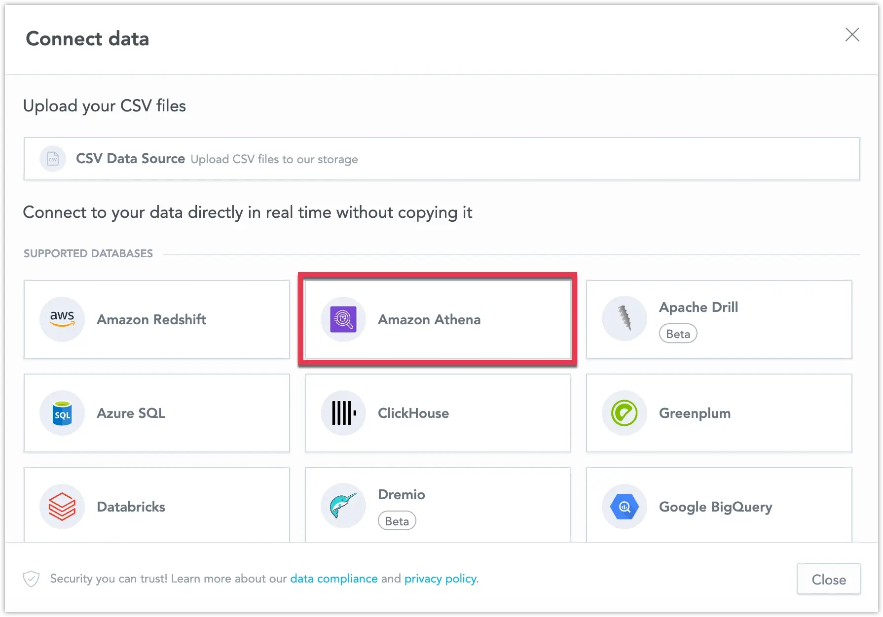 You can now connect directly to Amazon Athena and create an Amazon Athena data source within GoodData. This new feature expands your data connectivity options, enabling seamless analytics on data stored in Amazon S3 using Athena.